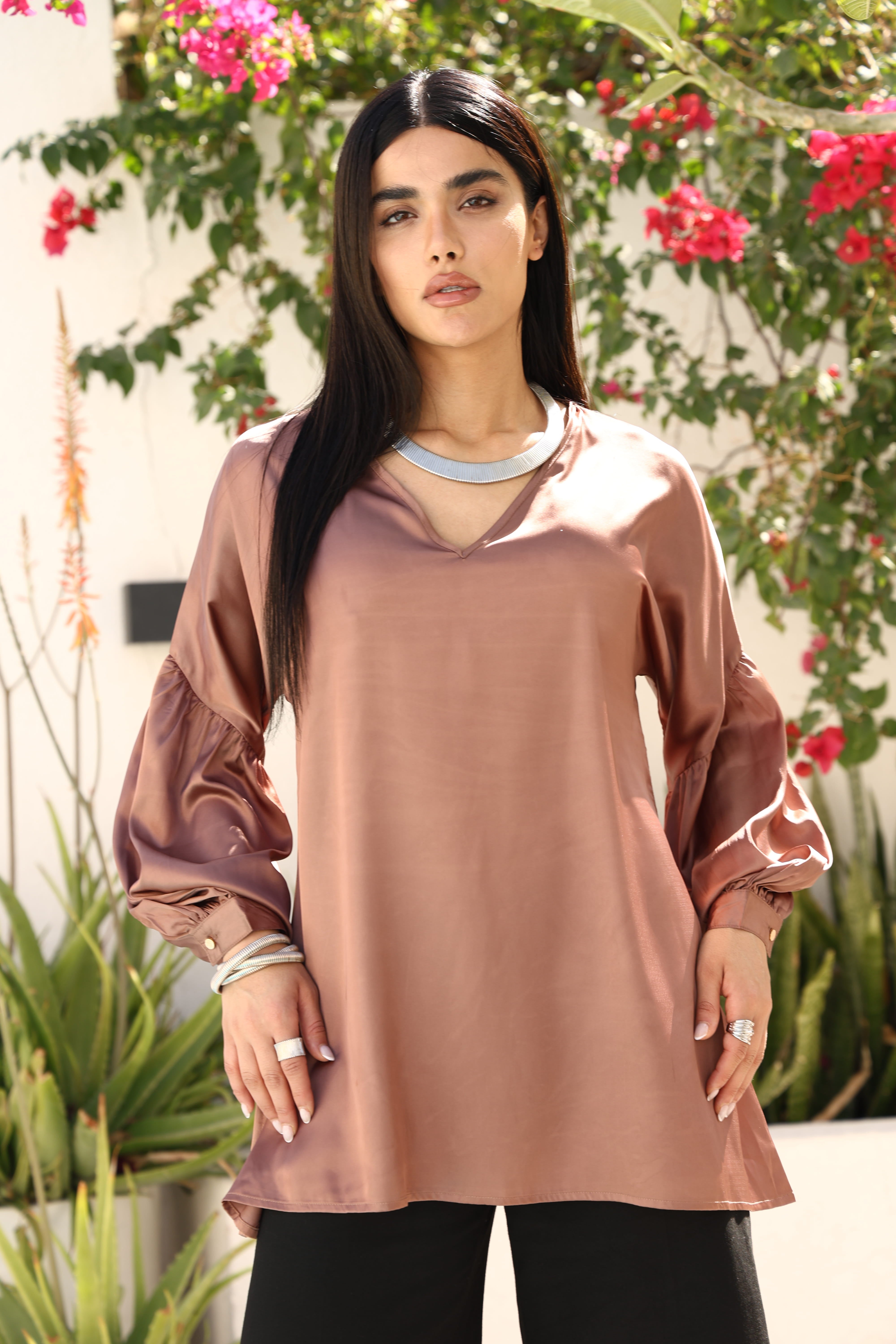A relaxed-fit top with a soft V neckline and statement sleeves. Easy to style for everyday wear or elevated casual looks.