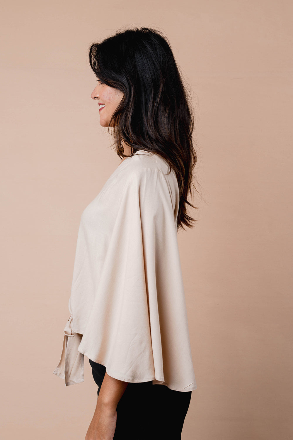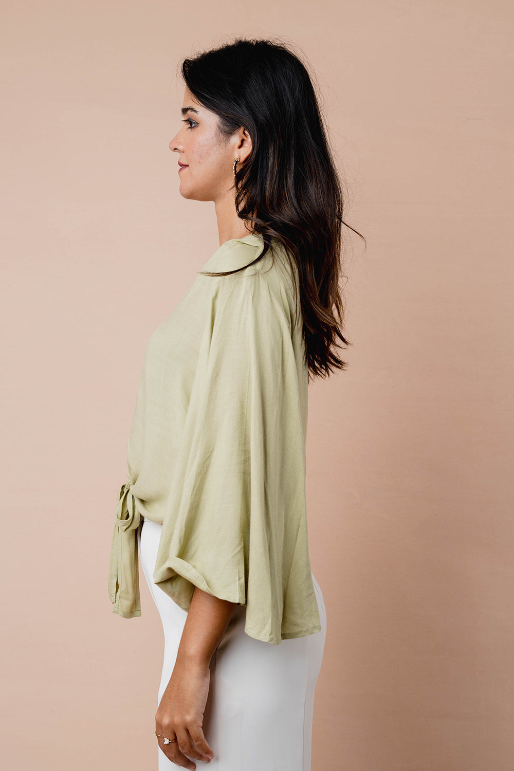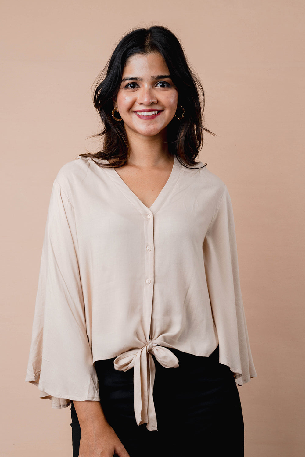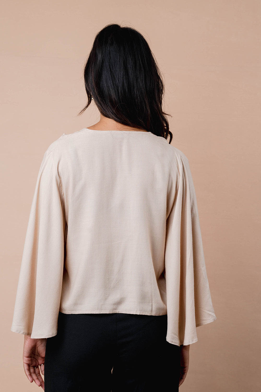 Relaxed top with soft flare sleeves and a notch neckline. Finished with a front tie detail and a curved hem for easy movement. Ideal for pairing with both trousers and skirts.