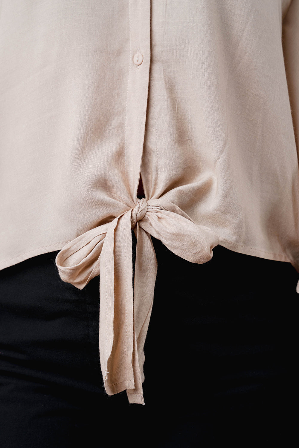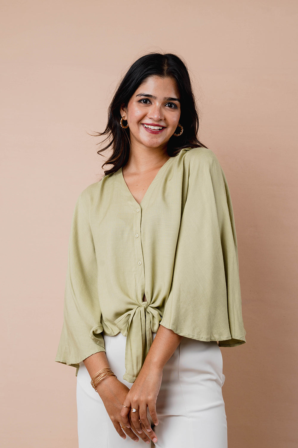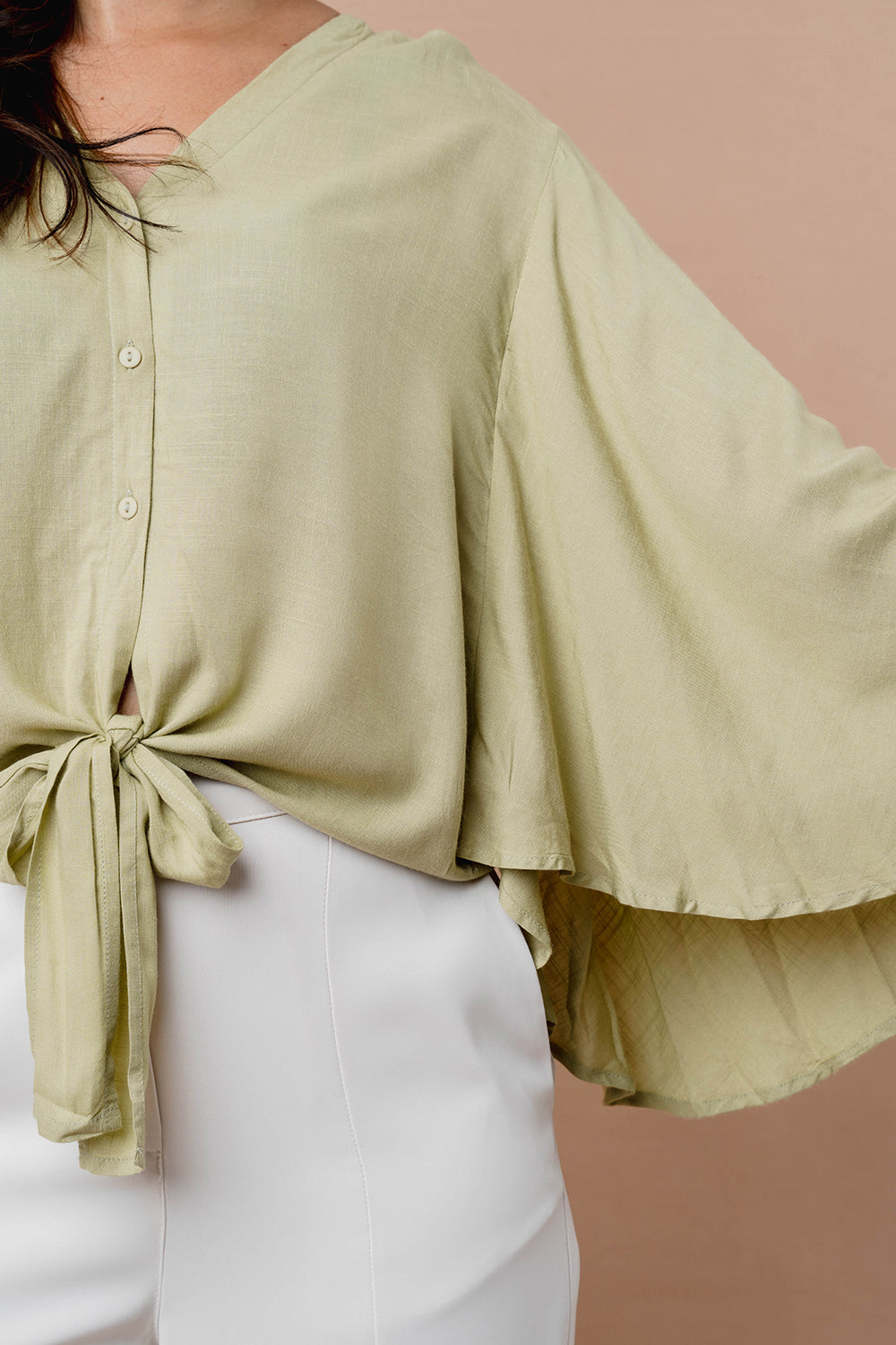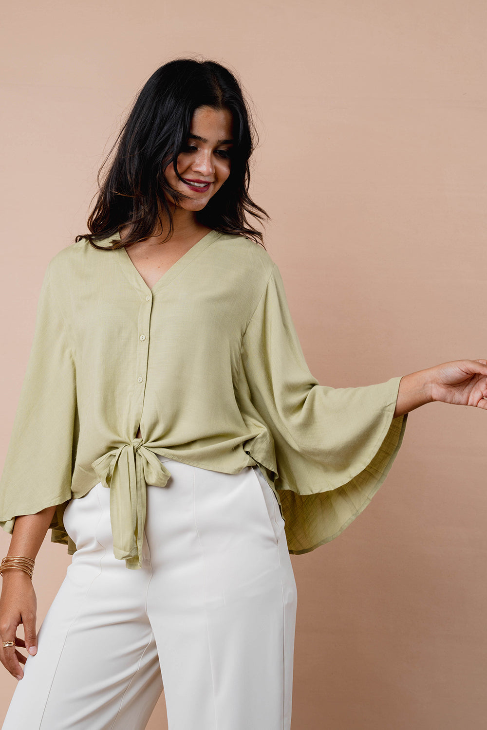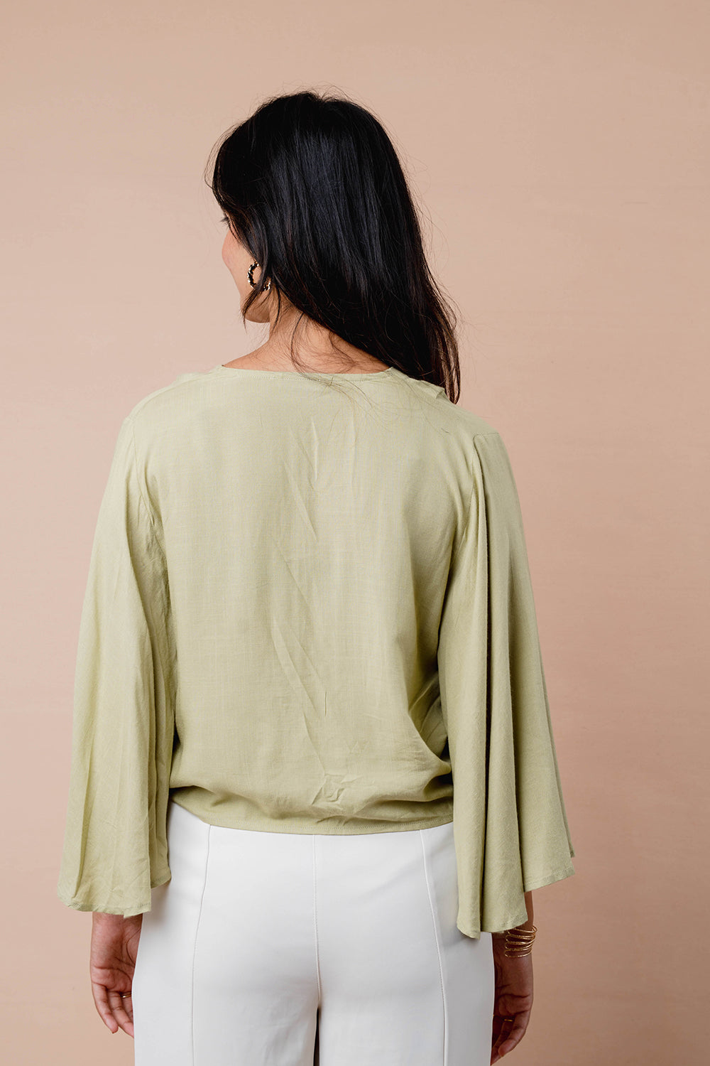 Relaxed top with soft flare sleeves and a notch neckline. Finished with a front tie detail and a curved hem for easy movement. Ideal for pairing with both trousers and skirts.