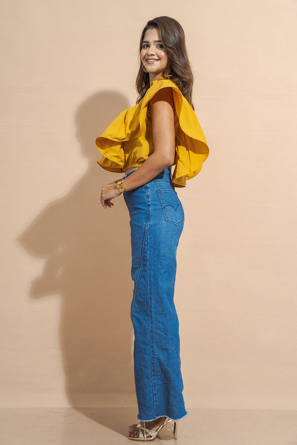A relaxed fit top featuring a V neckline and statement flutter sleeves. Designed with a gathered waist seam for a soft drape and a slightly cropped length. Finished with a straight hem and breathable construction for everyday wear.