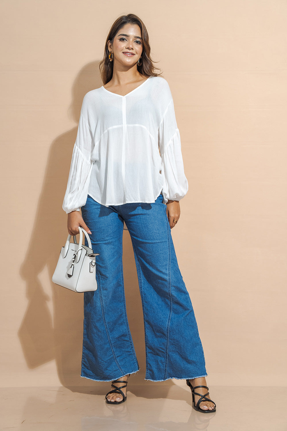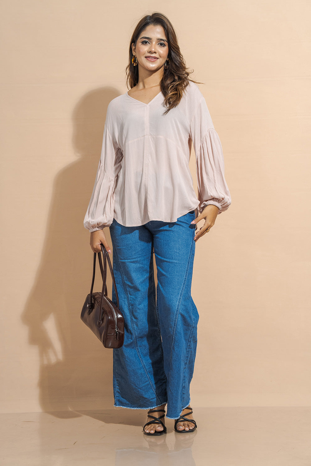A lightweight long sleeve top featuring a V neckline and relaxed silhouette. Designed with subtle gathers at the cuffs and a straight hemline for a clean finish. Easy to style for casual or elevated looks.