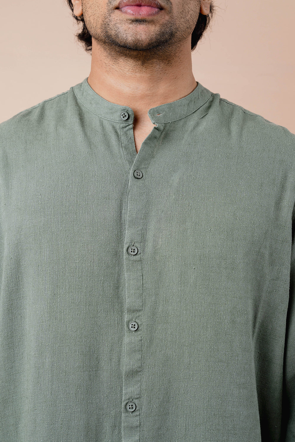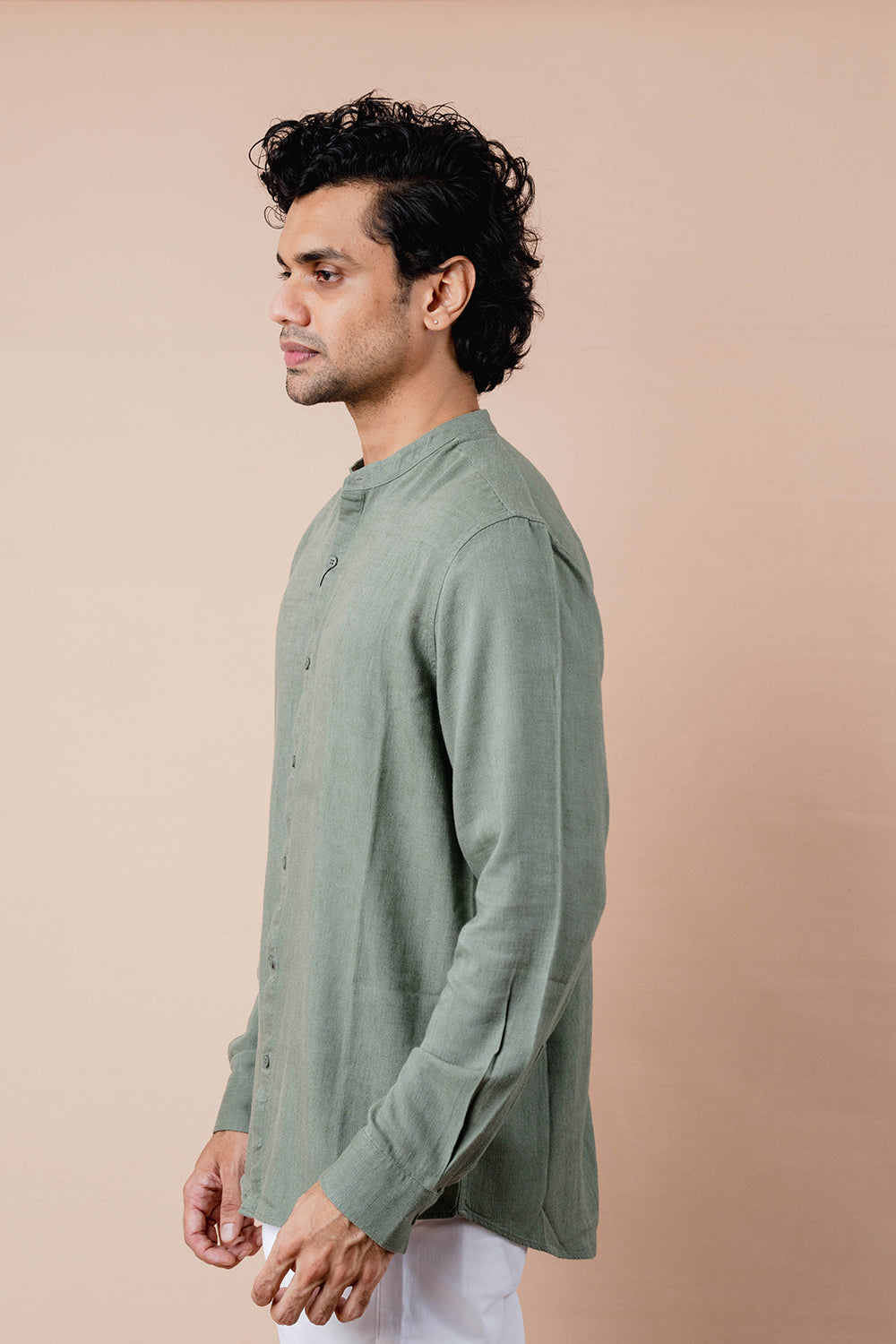 Long sleeve shirt with a mandarin collar and full button closure. Designed with a straight hem and a relaxed silhouette suitable for both casual and smart settings.