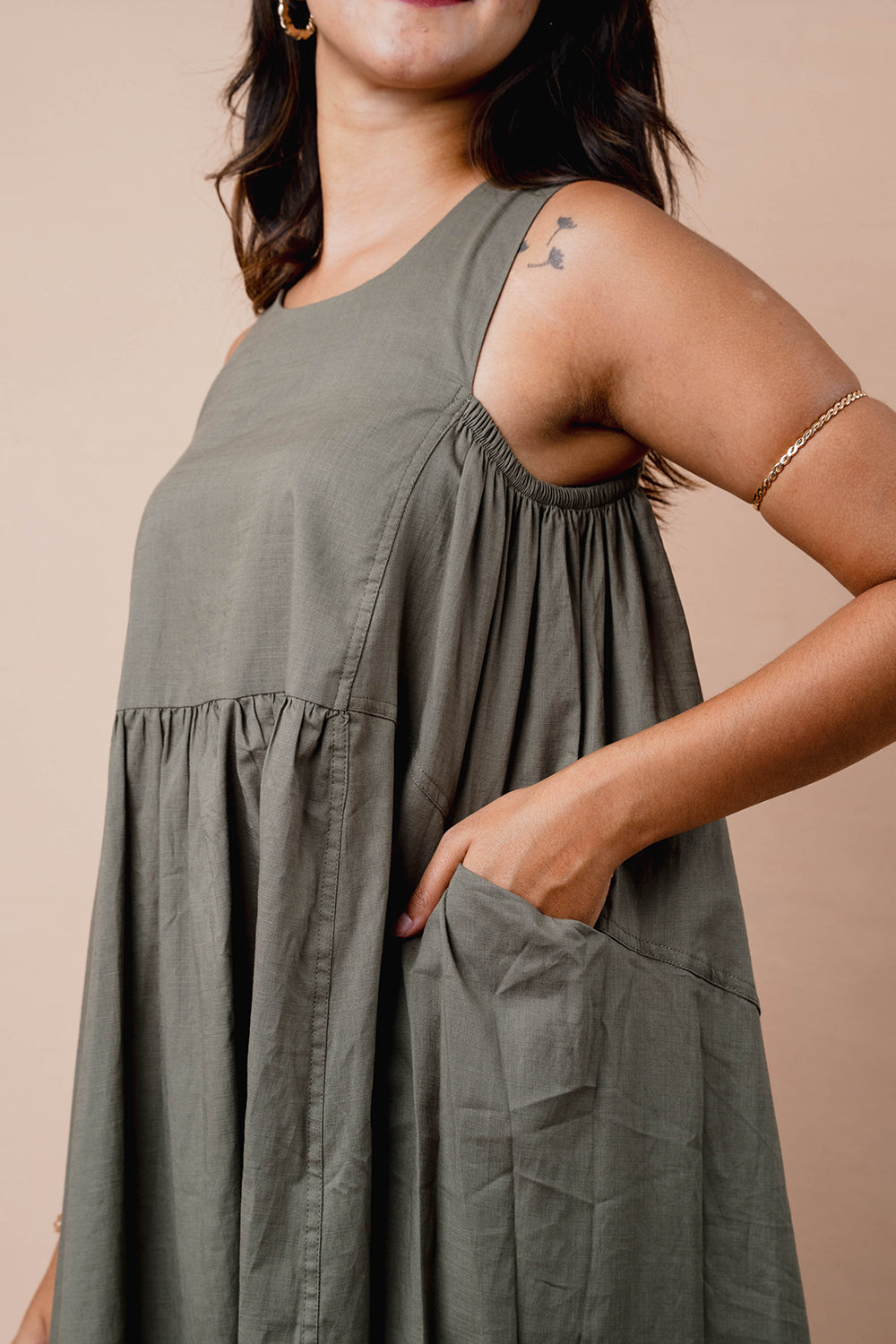 Sleeveless midi dress with a round neckline, gathered detailing at the bodice, and a flowy A-line silhouette. Features side pockets and a straight hem and a back key hole