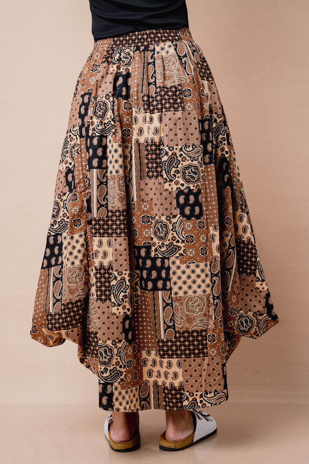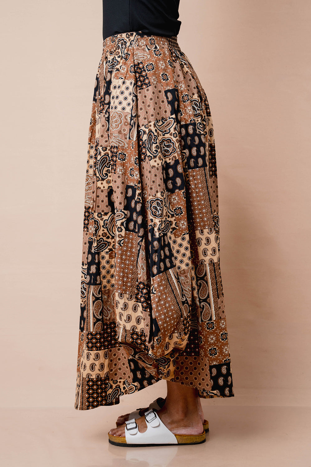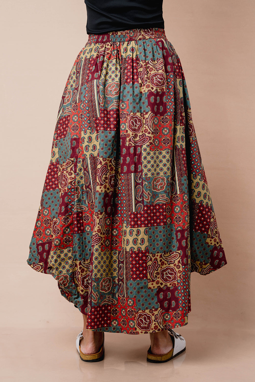 Flowy long skirt with an elasticated waistband and gathered fullness. Designed with a wide, graceful flare and a straight hem. with one side cowl and slit