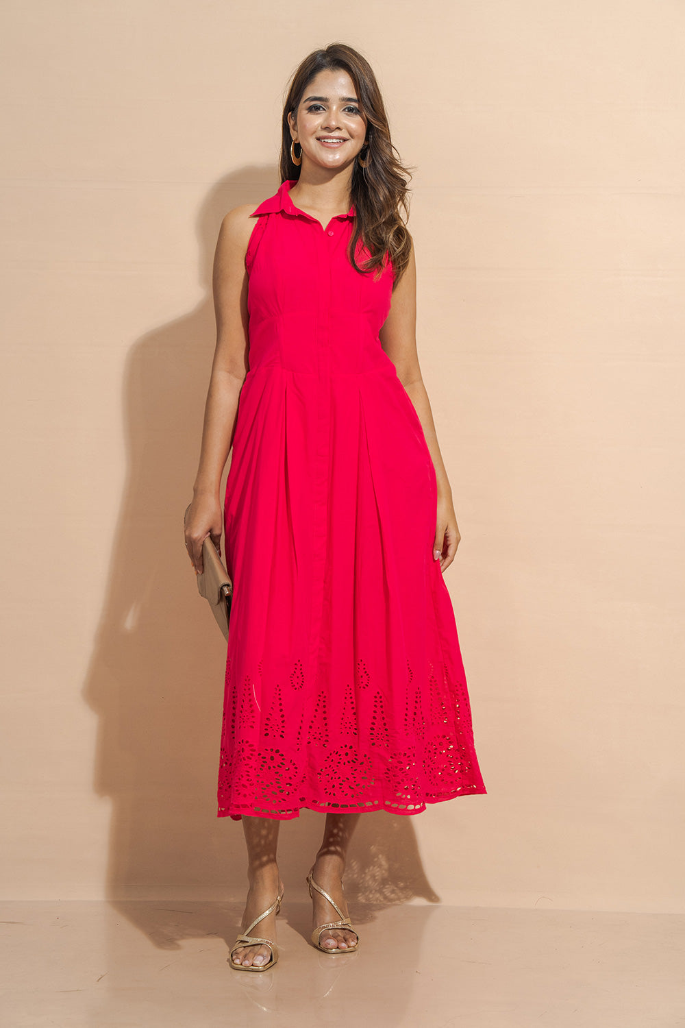 A halter peter-pan collar midi dress featuring a fitted bodice and softly flared skirt. Designed with a back tie closure and an embroidered hem finish. Falls to a mid-calf length with a clean, structured silhouette.